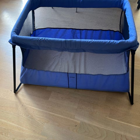 Babybjörn reiseseng i svart tekstil med netting på sidene. Sengen har myk madrass og leveres med tilhørende bæreveske med håndtak. Egnet som sammenleggbar seng til baby og småbarn hjemme eller på reise.