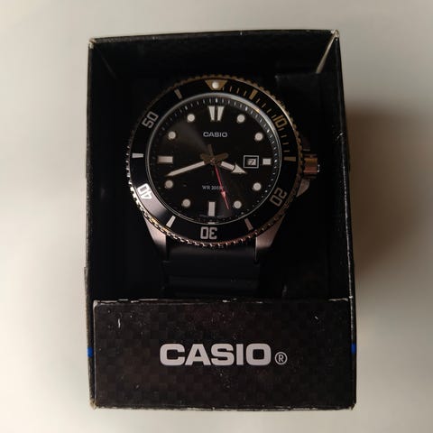Casio herreklokke med analogt urverk. Klokken har svart urskive med tydelige timemarkeringer. Kommer med ekstra ledd, klokken kommer i original Casio-eske.