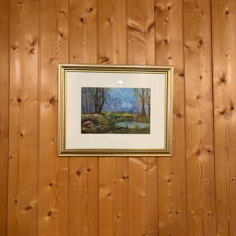 Sprekk i glass, så det må skiftes. Liten bøy øverst på selve bilde. Se bilde. Ellers i god stand. Rammemål: 44.5 cm x 41 cm.