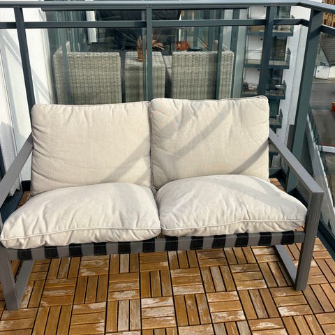 *Modulbasert loungegruppe – bygg som 3+2 eller 2+2 med stol (evt 2-seter med 3 stoler mv) - plass til 7-8 pers hvis man ønsker. Mål (når satt opp som på bildene): Langsiden 2,80 og 2,20 (men kan justeres som man ønsker). Hver modul Bredde: 69-73 cm / Dybde: 73 cm (Modulsofa kan også brukes som loungestoler). Lekkert glassbord som hører til. Pris for alt: Kr 8900