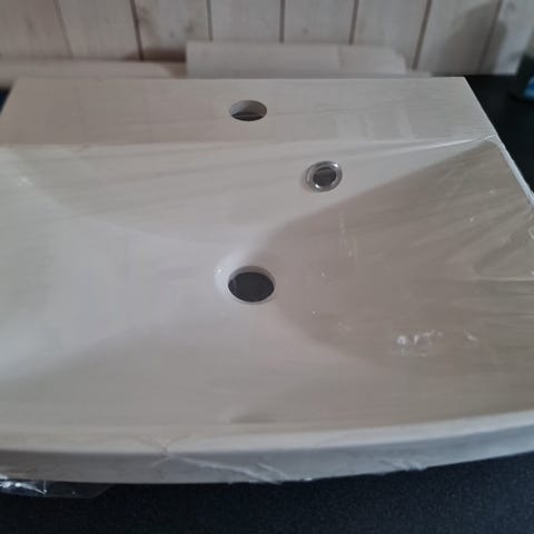 Hvit servant i porselen med rektangulær form. 60x40cm. Servanten har hull for armatur og overløp. Det følger med et ettgreps Oras blandebatteri og avløpsdel slik som vist på bildene. Egnet for montering på baderomsmøbel eller benkeplate, avhengig av tilpasset innfesting og mål hos kjøper. Må hentes. Mål 60cm bredde og 40 cm dyp.