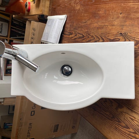 Hvit porselen servant med Oras blandebatteri.