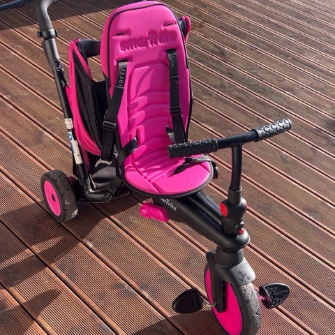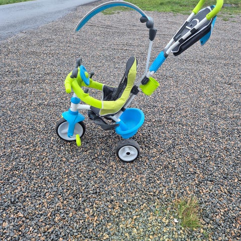 Egnet for små barn som skal sitte og trilles, med mulighet for å bruke pedalene når barnet er større og mer selvstendig.
