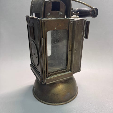 Ekte, britisk antikk vognlykt produsert av H. Miller & Co., Birmingham, datert ca. 1885–1900. Dette er en autentisk messinglykt fra hestekjøretøyenes storhetstid.