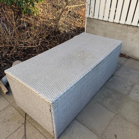 Pent brukt putekasse i rotting, med trekk som beskytter putene. Ny pris 2500,-