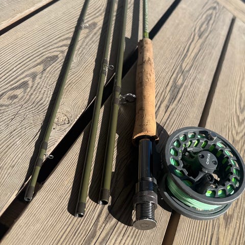 Fluesnelle med påspolet snøre og tilhørende futteral. Snellen har åpen spolekonstruksjon og er egnet til fluefiske. Futteralet gir beskyttelse under lagring og transport. Nærmere tekniske spesifikasjoner som størrelse og vekt er ikke oppgitt.