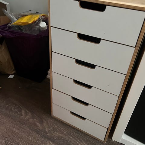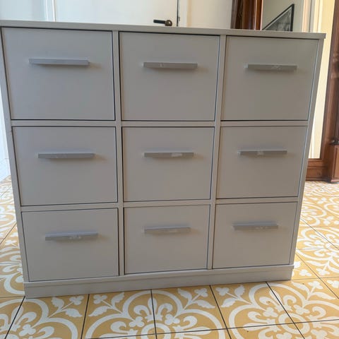 Ellos skuffeseksjon med 4 skuffer i hvit utførelse. Møbelet består av en rektangulær ramme med to rom for skuffer ved siden av hverandre, og fire separate skuffer som monteres i seksjonen. Skuffeseksjonen er egnet til oppbevaring i for eksempel stue, gang, soverom eller kontor. Designet er enkelt og funksjonelt, med rette linjer og glatt overflate. Leveres som vist på bildene, delvis demontert med løse skuffer og korpus.
