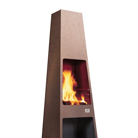 Vedfyrt utepeis i svart stål. Sylinderformet modell med glassfelt i front for innsyn til flammene og åpning for vedinnlegg. Egnet til bruk utendørs på terrasse eller i hage som varmekilde og ildsted. Peisen har håndtak og luker for lufttilførsel og asketømming. Frittstående konstruksjon som kobles til pipe eller røykrør etter behov.