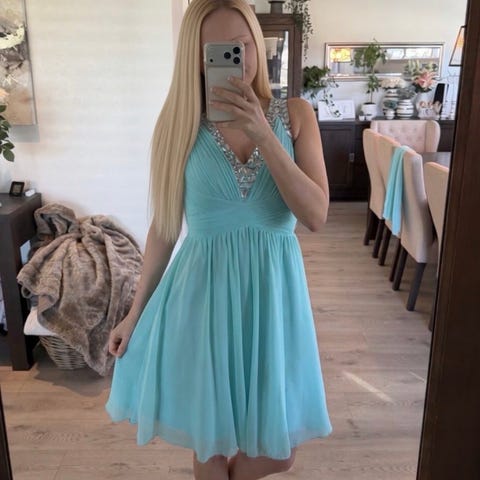 Kjempefin kjole med V-hals og åpen rygg. Italiensk design, laget i Italia. Kjolen er tilgjengelig i rosa farge også.