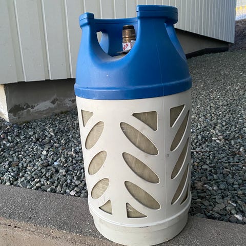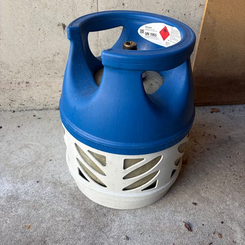 5 kg propanflaske i kompositt. Ca 50 % med gass igjen. Nypris for tom flaske er ca 1000 kr.