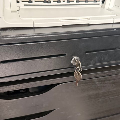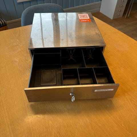 Casio TE-300 kassaapparat med tilhørende kassaskuff. Kassaapparatet har integrert kvitteringsskriver og numerisk tastatur med funksjonstaster for registrering av salg. Kassaskuffen har rom for sedler og mynt, med fjærer for å holde sedlene på plass. Egnet for bruk i butikk, kiosk eller andre kontantbaserte utsalgssteder.