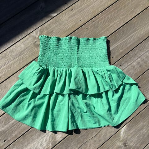 Neo Noir skjørt i bomull for dame i størrelse M. Skjørtet er beige og har et langt, voluminøst snitt med flere horisontale søm- og rynkedetaljer. Stoffet er lett og faller mykt. Passer til hverdagsbruk og mer pyntede anledninger, og kan kombineres med ulike topper og sko for å variere uttrykket.
