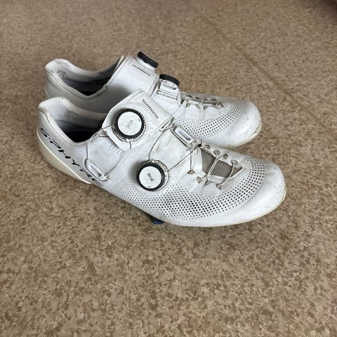 Lake CX219 sykkelsko i størrelse 45. Modellen er en landeveissko med hvit overdel og svarte detaljer. Skoene har perforert overdel for ventilasjon og strammesystem med dreiehjul og vaier for jevn tilpasning. Sålen er tilpasset landeveispedaler med tre skruehull (3-bolt cleat-standard). Egnet for landeveissykling og trening der det ønskes stive sykkelsko med god passform.