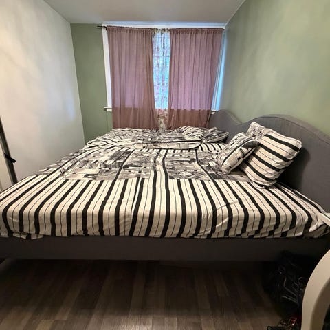 IKEA SÄBÖVIK seng i grått tekstiltrekk.