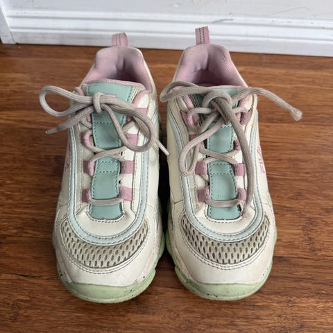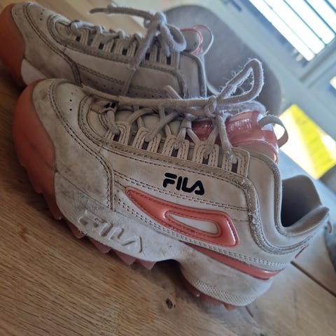 Fila joggesko for barn i størrelse 33. Skoene er i hovedsak hvite med lilla og rosa detaljer. Overdelen er en kombinasjon av mesh og syntetisk materiale, med lisser for lukking. Polstret pløse og hælparti gir ekstra komfort. Modellen er tilpasset jente, men kan brukes av alle som passer størrelsen. Egner seg til hverdagsbruk og lett aktivitet både inne og ute, avhengig av underlag og værforhold.