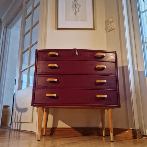 Elegant kommode i klassisk stil, dyp sort farge med antikk gullfargede detaljer som gir et eksklusivt og sofistikert uttrykk. Alle skuffene glir lett