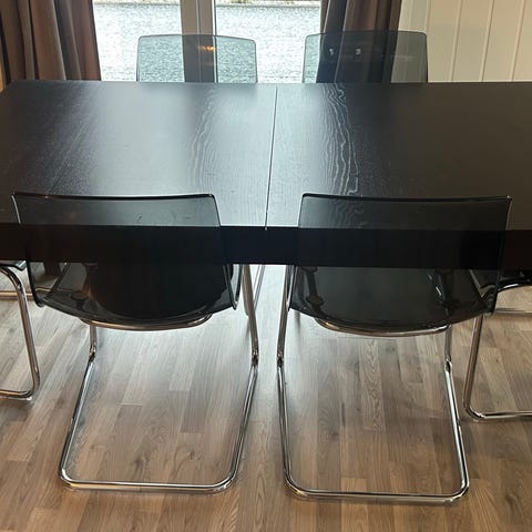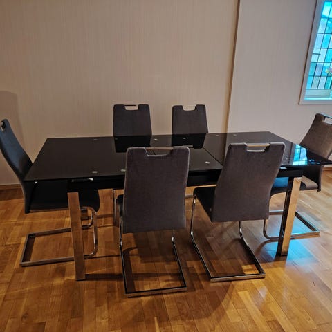 Sort spisebord som kan utvides, har plass til 6-8personer som det står nå.