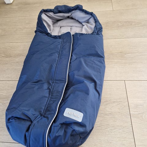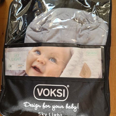 Voksi Sky Light vognpose i blå farge. Vognposen har flere åpninger til seler, slik at den kan tilpasses ulike typer barnevogner.