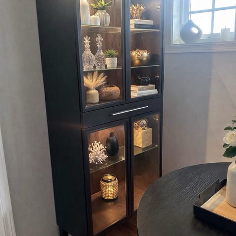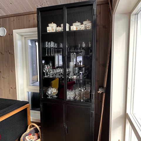 Et lekkert, svart vitrineskap selges. Kan både brukes til glass og bøker. Kjøpt på Home & Cottage. Kommer fra dyre - og røykfritt hjem.