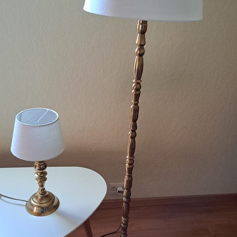Elegant gulvlampe i klassisk stil med messingfot og dekorativ lampeskjerm.