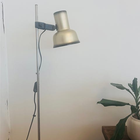 Gir varmt og stemningsfullt lys med tre lyskilder. Lampeskjermen har fine detaljer og stoffkant. Står stødig og fungerer som den skal.
