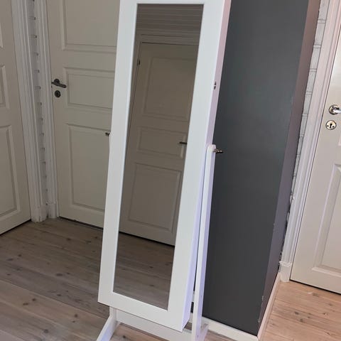 Bohus smykkeskap med speil i hvit utførelse. Speilet står på fot og kan vippes for ønsket vinkel. Innvendig har skapet flere kroker, stenger og hyller til oppbevaring av smykker og tilbehør.