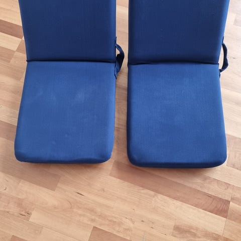 Sammenleggbare sitteputer i mørk blå farge. Putene har rygg og sitteflate i polstret materiale, med bærehåndtak på siden for enkel transport. Undersiden har et glatt materiale som er lett å tørke av. Egner seg til bruk på gulv, benk eller andre harde underlag, for eksempel inne, på hytte eller ved ulike fritidsaktiviteter hvor man ønsker ekstra sittekomfort.