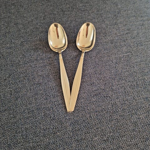2 like skjeer i ok /pent bruksskikk.MEN den ene har en liten inntrykning på tvers midt i skjebladet. Se bilder,jeg tror jeg har fått det med på bildet.