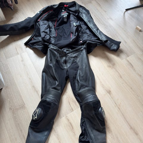 Litt mindre ventilert skinnjakke, glidelås for å sette sammen med bukse, fin på tidlig vår og høst. Halvsporty fit, passer overalt. Ingen skader eller slitasje, rengjort etter behov og fått skinnbehandling på slutten av hver sesong. Ryggskinne kan medfølge. 3000,-
