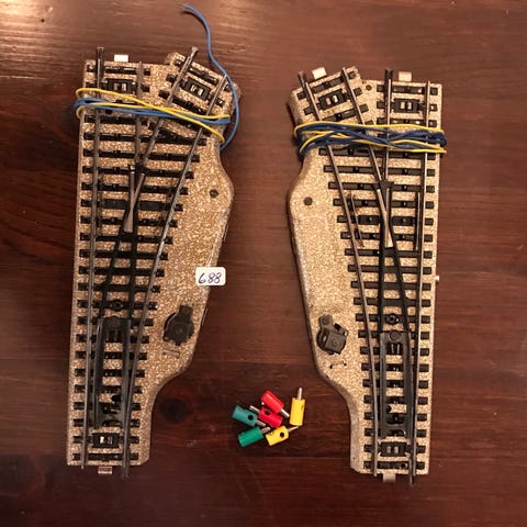 Her har du muligheten til å komplettere/bygge ut banen din med to elektriske sporskifter. Sporskiftene virker utmerket. Lyser og skifter greit. Ellers ubetydelige bruksspor, noe støvete og skitten, kan også ha noe kortere ledninger, lim og fargerester. Uten eske.