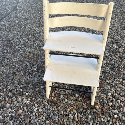 Stokke Steps høy barnestol i hvit plast med ben i tre. Stolen har integrert rygg- og sidestøtte som omslutter barnet, samt fotbrett for bedre sittekomfort. Egnet som spise- og sitteplass ved bord for små barn. Plastsetet er formstøpt og lett å tørke av. Det er synlige sprekker og merker i plasten på ryggdelen, se bilder for tilstand.