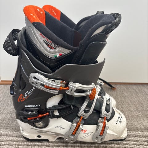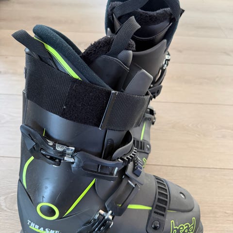 Head Thrasher 80 alpinstøvler i størrelse 44. Støvlene er svarte med grønne detaljer og har flex på 80. Ifølge teknisk informasjon har modellen lestbredde på 96–100 mm. Støvlene har flere spenner og powerstrap øverst for å gi god tilpasning rundt fot og legg. Egnet for alpint bruk i bakke.