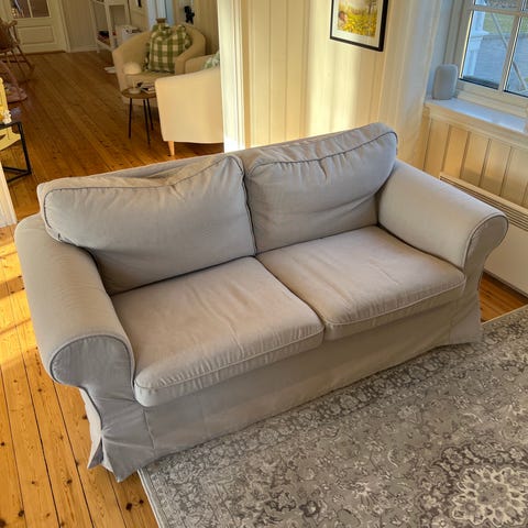 Sofa gis bort mot henting. Glidelåsene på putetrekket til den ene sitteputa er ødelagt.