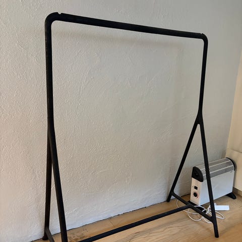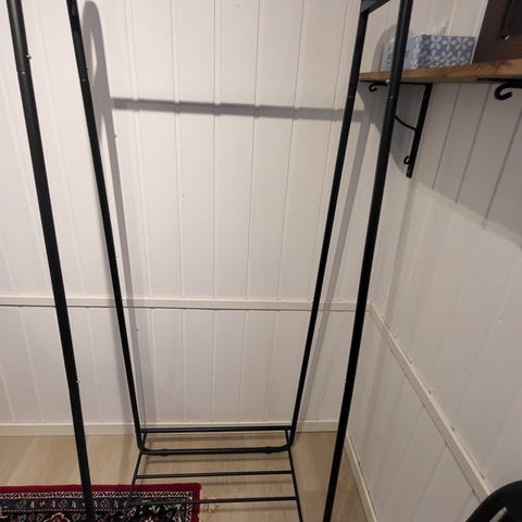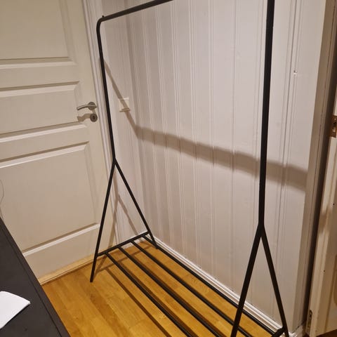 Stativet er stabilt og lett å flytte rundt takket være hjulene. Tar liten plass, men gir god hengeplass til jakker, skjorter og annet.