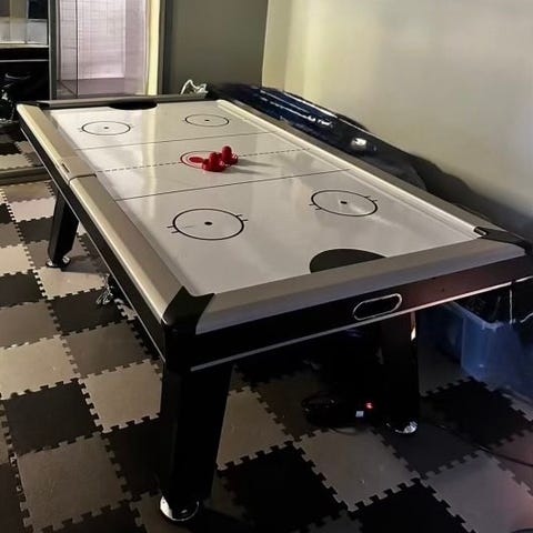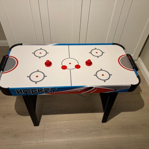 MP Sports airhockeybord i hvit og svart utførelse med røde detaljer. Bordet har spilleflate med markerte baner og målsoner, samt luftehull i platen for jevn glid på pucken. Stabil ramme med rette ben og tverrbjelke. Leveres med røde pushere og pucker slik det vises på bildene. Det er synlige merker/skader i en del av spilleflaten, se nærbilder for tilstand.