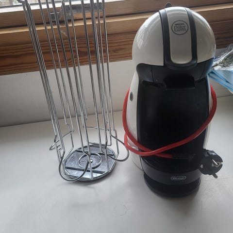 Dolce Gusto kapselmaskin i hvit farge. Maskinen bruker kaffekapsler til tilberedning av varme drikker som kaffe og andre kapselbaserte varianter. Den har avtagbar vanntank og dryppbrett. Egnet for bruk på kjøkken, kontor eller andre steder der det er behov for enkel tilberedning av kapselbasert kaffe.