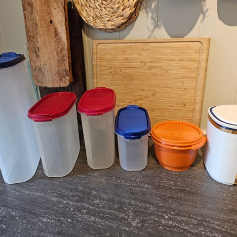 oppbevaringsbokser i plast med lokk i ulike farger og størrelser. Settet består av flere bokser som egner seg til oppbevaring av matvarer på kjøkkenet, som tørrvarer, rester eller matpakke. Boksene har tettsittende lokk og kan stables for plassbesparende lagring i skap eller skuffer.