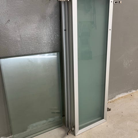 Kjøkkenskapdører med frostet glass og ramme i aluminium.