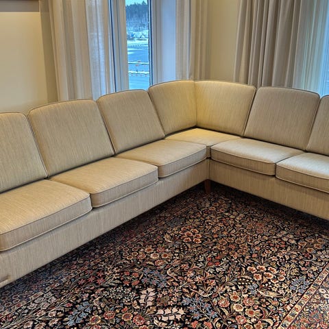 Fin Slettvoll hjørnesofa, 280x250 cm, med sittehøyde 45 cm.