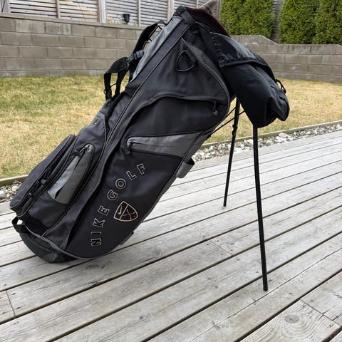 Fastfold pencilbag med stativ i svart. Bagen har lett konstruksjon med sammenleggbart stativ og bærestropp for enkel transport. Topp med flere inndelinger for køller og en sidelomme for mindre utstyr og tilbehør. Passer til oppbevaring og transport av golfkøller på banen eller til trening.
