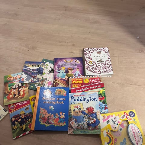 6 bøker med lyd hvor batteriet er tomt (går sikkert an å bytte batteri) tekst og mange bilder som likevel er gøy å se i. Bøker fra go’boken. Bøker fra kosevenner er ødelagt i festet bak, men boken er ellers i grei stand. Bok om Fantus, nattahistorier, dyreunger (hvor man kan føle på pelsen) og dinosaurboken (lyd fungerer) er i god stand. Mye bøker for pengene. Må hentes på Tiller.