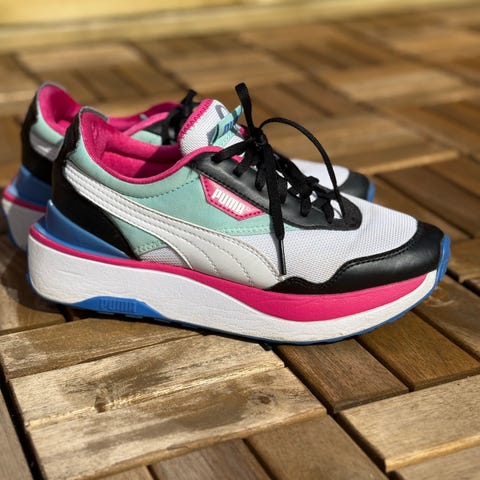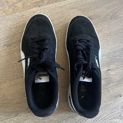 Puma SoftFoam joggesko i størrelse 37. Skoene er i mørk blå tekstil med hvite detaljer og hvit såle. Modellen har snøring foran og polstret hælkappe for bedre komfort. SoftFoam-innersåle gir myk demping ved bruk. Egner seg som hverdags- og fritidssko.
