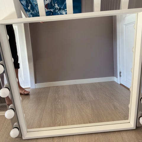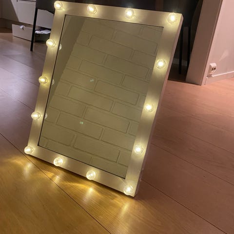 IKEA speil med lysramme i hvit farge. Rektangulært speil med innebygde lyspunkter rundt rammen. Egnet som sminkespeil eller til bruk på soverom, gang eller andre rom der det er behov for speil med ekstra belysning.