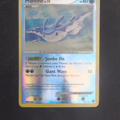 KI GENERERT INFO: Pokémon Mantine samlekort. Kortet viser Pokémonen Mantine med illustrasjon på forsiden og standard Pokémon-bakside. Egnet for samling eller spill i Pokémon Trading Card Game. Ytterligere detaljer om utgave, språk og årgang fremgår av selve kortet.