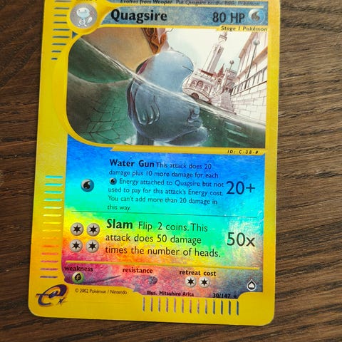 KI GENERERT INFO: Pokémon Quagsire samlekort. Kortet viser Pokémon-figuren Quagsire, som er en vann-type. Forsiden har illustrasjon av Quagsire med angrepene Surf og Earthquake, samt kortinformasjon som HP, energikrav og skadeverdier. Baksiden har standard Pokémon-design med Pokéball-logo. Egner seg til samling eller som spillkort i Pokémon Trading Card Game.