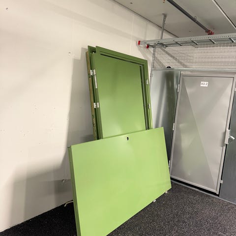 2 stk dører i stål farge grønn mål: 209x 240 cm gang dør + sidefelt mulighet for dørpumpe montering ikke monter før helt nytt stått på lageret i 2 år nå klar for ny eier