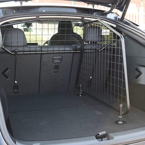 Bilbur lastegitter og skillevegg i svart metall. Består av et øvre gitter som monteres bak bakseteryggen og en vertikal skillevegg som deler bagasjerommet. Konstruert med horisontale stenger og justerbare føtter mot gulv og tak for stabil montering. Egnet for å avgrense bagasjerom, sikre last eller holde hund atskilt fra kupeen.