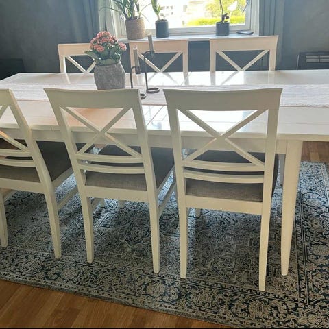 Spisebord med stoler fra Bohus. Følger med to ileggsplater på ca 50 cm dybde. Går lett 12 personer rundt dette bordet. God bredde med god mulighet for oppdekking.