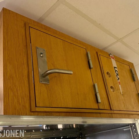 Nøkkellås på dørene og skuffe bak høyre dør.