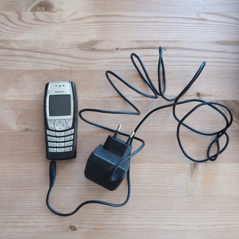 Gammel Nokia 6230. Lader følger med. Ikke brukt på mange år - men skal fungere (se bilde «Sett inn SIM-kort»
